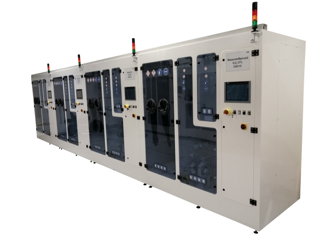atp GmbH entwickelt und realisiert aufgabenspezifische Misch- und Dosieranlagen zur Herstellung von individuell benötigten Ätzlösungen. Der Ansatz erfolgt über eine vollautomatische Prozesssteuerung, so dass ein Höchstmaß an Dosiergenauigkeit und Reproduzierbarkeit garantiert wird.